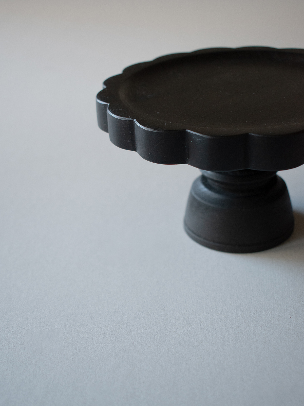 お花を模した柔らかなシルエットと草木染めによる深い黒色が美しい、とても素敵な逸品です。スマッシュケーキや果物、お気に入りのジュエリーなど。使う方それぞれの「舞台」として、ご自由にお使いいただけます。