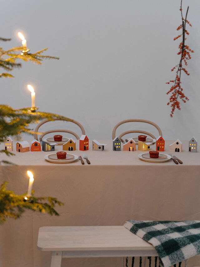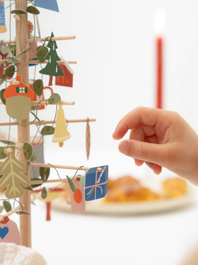 シンプルなブナ材のツリーに、12月1日からセーターやジンジャーブレッドなどの紙製オーナメントを飾っていくと、クリスマスにツリーが完成します。