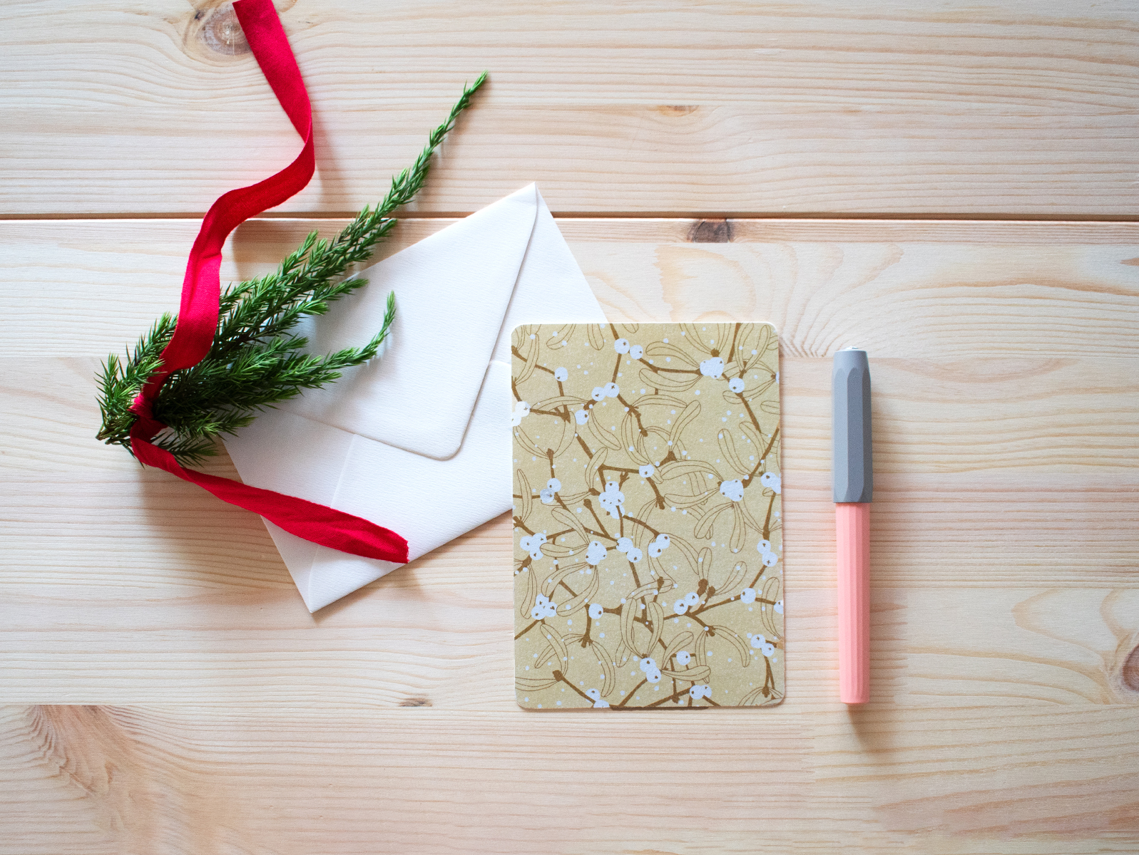 幸運を呼び込むとされるヤドリギをミニマルにアレンジした3色のクリスマスカードは、「言葉を包む」がコンセプト。包装紙で一つずつ丁寧に包まれた贈り物をイメージした、日本らしさも感じる一枚です。