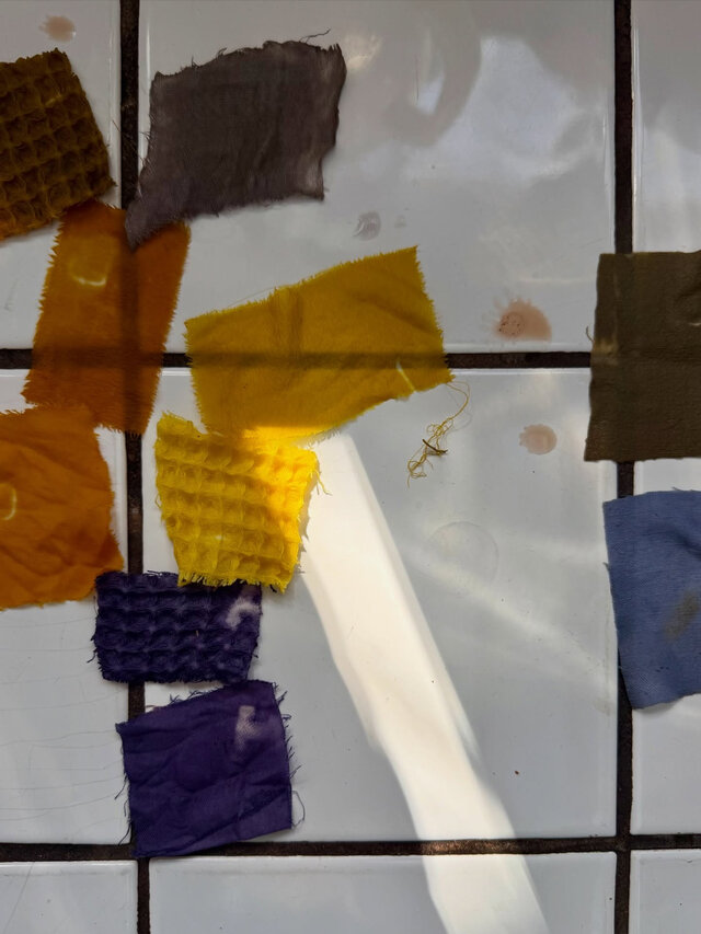 染料の材料は、水と少量の植物、そして鉱物添加物(ミョウバン、クエン酸、タンニン、鉄)。
