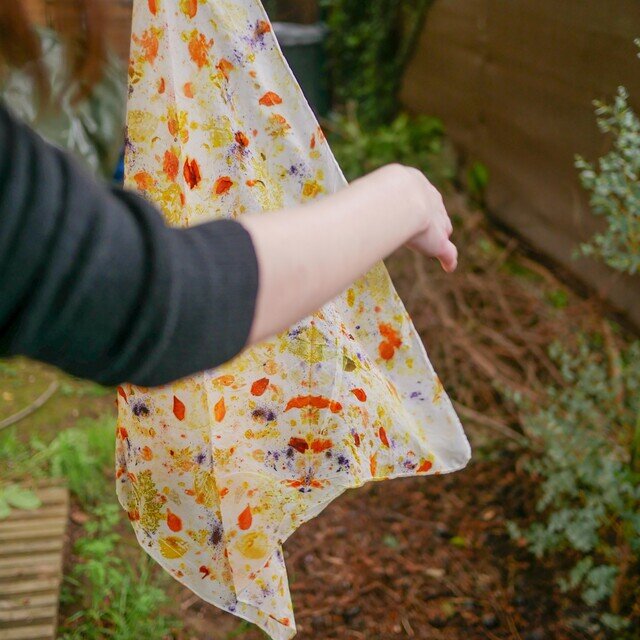 使用したのは、タンニンを豊富に含んださまざまな葉っぱや植物たち。その多くは、染める日の朝にお庭で摘んだばかりの新鮮なもの。中には、アトリエへ向かう道すがら、街の中で拾い集めた植物たちも混ざっています。