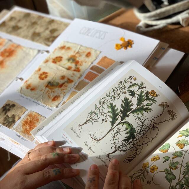 原料となる植物は、地元や認定パートナーの供給元から仕入れた植物(フランス産の茜やパステル(藍の一種)、ログウッド、ルバーブなど)を使用しているほか、 地元のレストランやお庭から集めたアボカドの皮、にんじんの葉、アーティチョークの葉、コスモスの花、クルミの殻、ガルナッツなども使用しています。