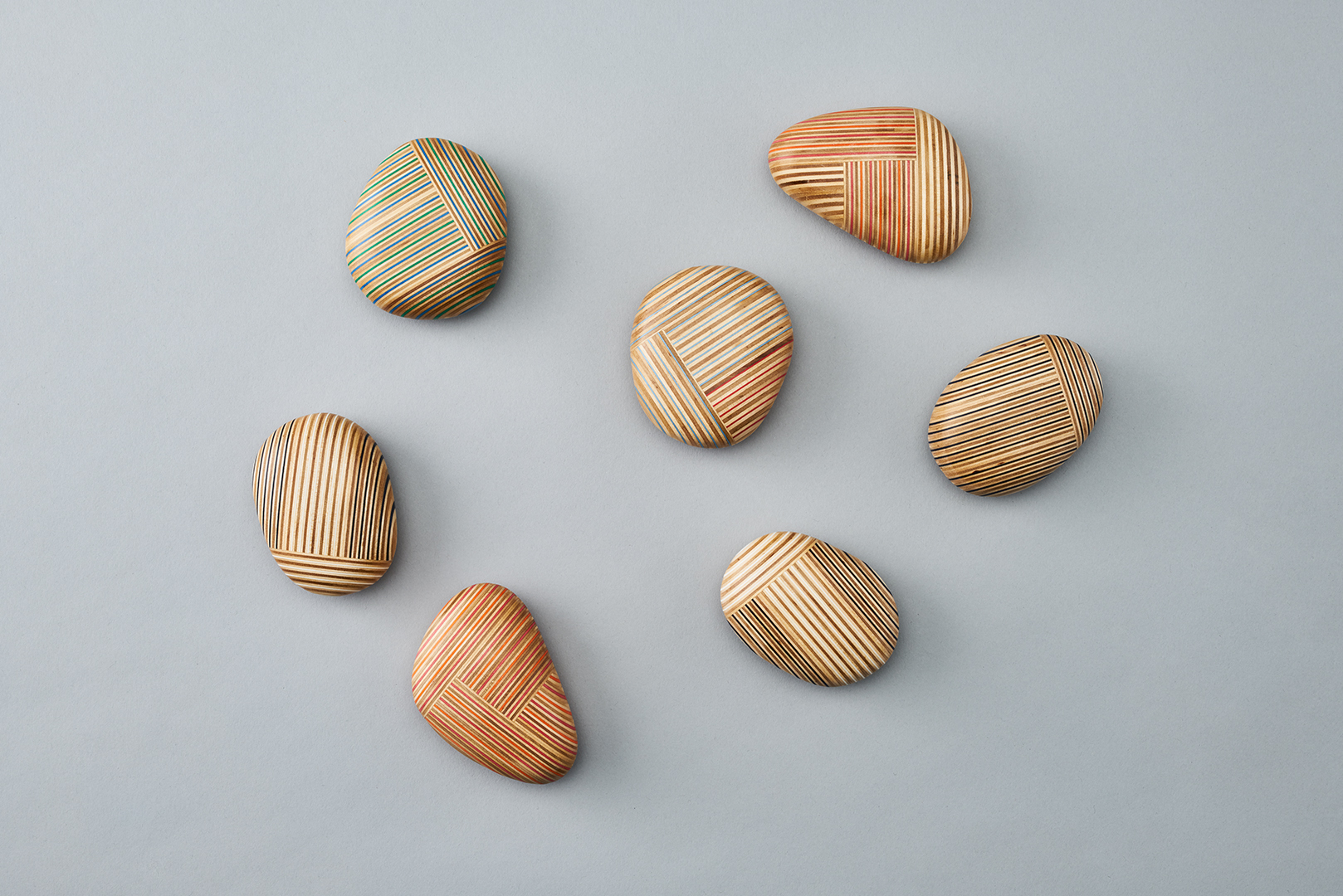 北海道のファクトリーブランド PLYWOOD laboratoryより、断面の美しさを楽しむ素材「Paper-Wood」をパッチワークのように繋ぎ合わせた、小石モチーフのペーパーウェイト「koishi」が届きました。