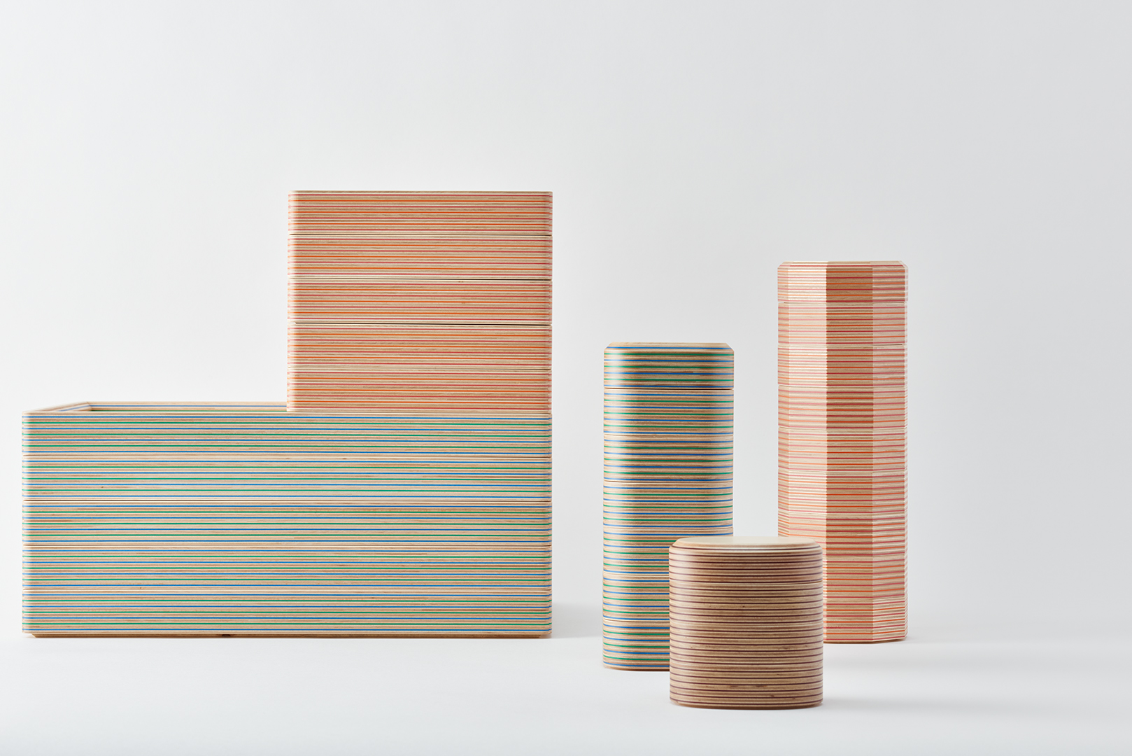 独自に開発された素材「Paper-Wood」はカラフルな再生紙と北海道産の木材を貼り合わせたまったく新しい合板。すべすべとした触り心地と、塗装などの後加工では決して得られない奥行きある表情を持っており、断面に現れるストライプは今までに見たことのない繊細な美しさを纏っています。