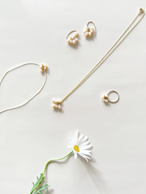 パールは、丸みのあるポテトパールと長細いライスパールを組み合わせています。満開のお花のような生き生きとした奥行きが、お顔まわりをぱっと華やかに彩ります。