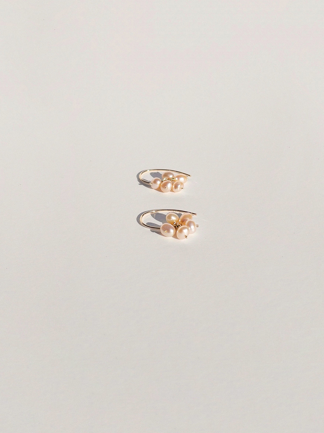 顔馴染みの良いナチュラルピーチの淡水パールをお花のように見立て贅沢に使用したピアスです。