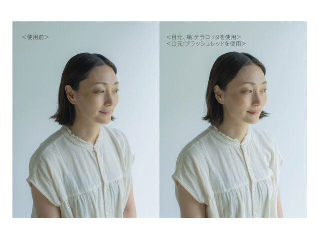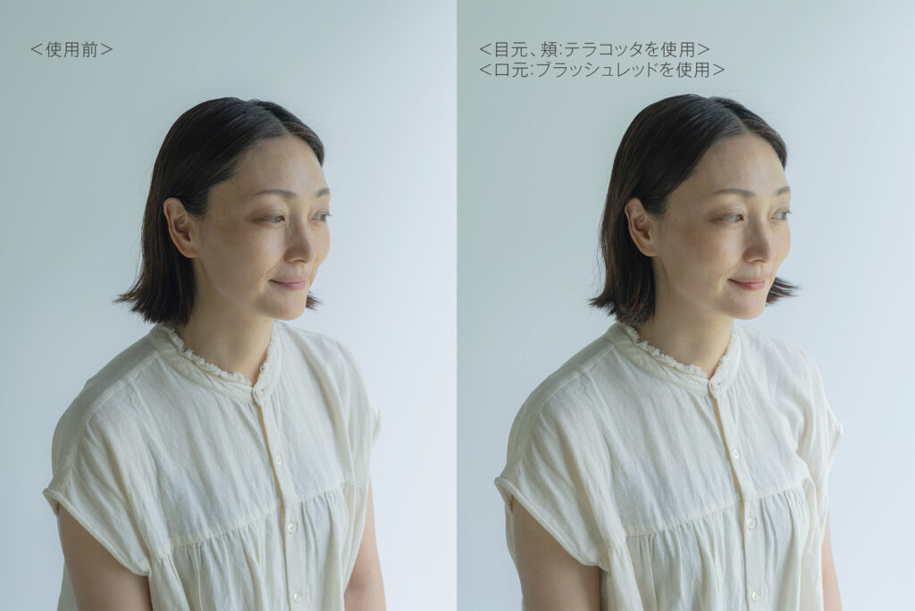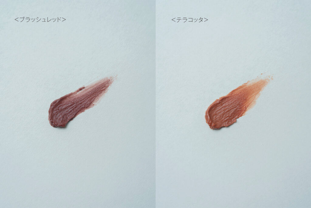 ブラッシュレッドは唇に自然な赤みを、テラコッタはまぶたや頬にあたたかみを添えてくれるカラーです。その日の気分や部位によって使い分けもおすすめです。