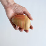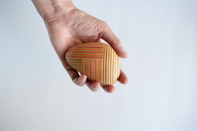 断面の美しさを楽しむ素材「Paper-Wood」をパッチワークのように繋ぎ合わせた、小石のような形状のペーパーウェイトです。