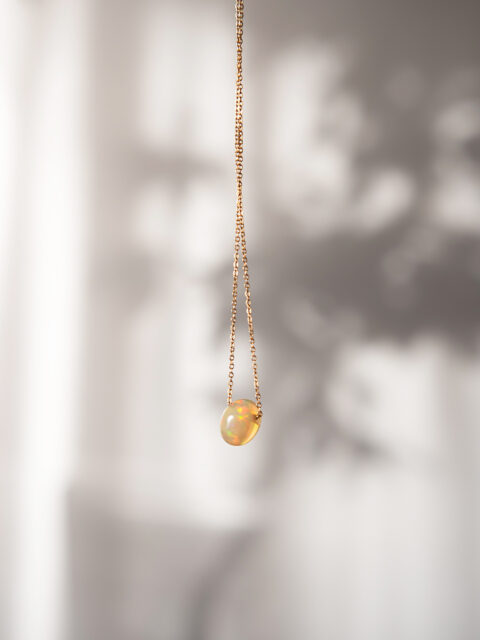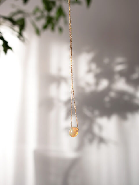 オパールは、透明度の高いもの、乳白色、イエロートーンなど地色の個体差がとても幅広く、原石から削り出し磨いている際にその色と出会えるのだといいます。お手元に届くオパールの色はさまざまですが、どれも肌の上に載せた際の遊色の美しさを一番大切にしています。