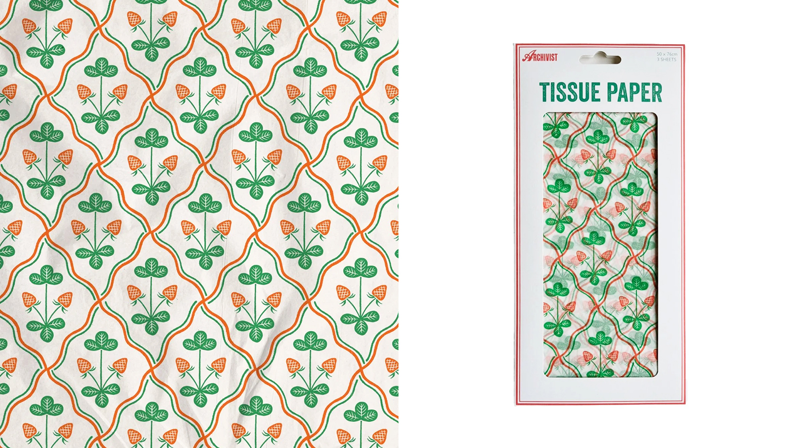 Museum of the Homeのコレクション奥深くにある見本帳で見つけた、モートン・サンダーの1930年代の明るいカーテン生地。アーキヴィストとコラボレーションした薄手のラッピングペーパー「Strawberry」の波打つダイアモンドのシルエットは、ここからインスピレーションを得て生まれました。